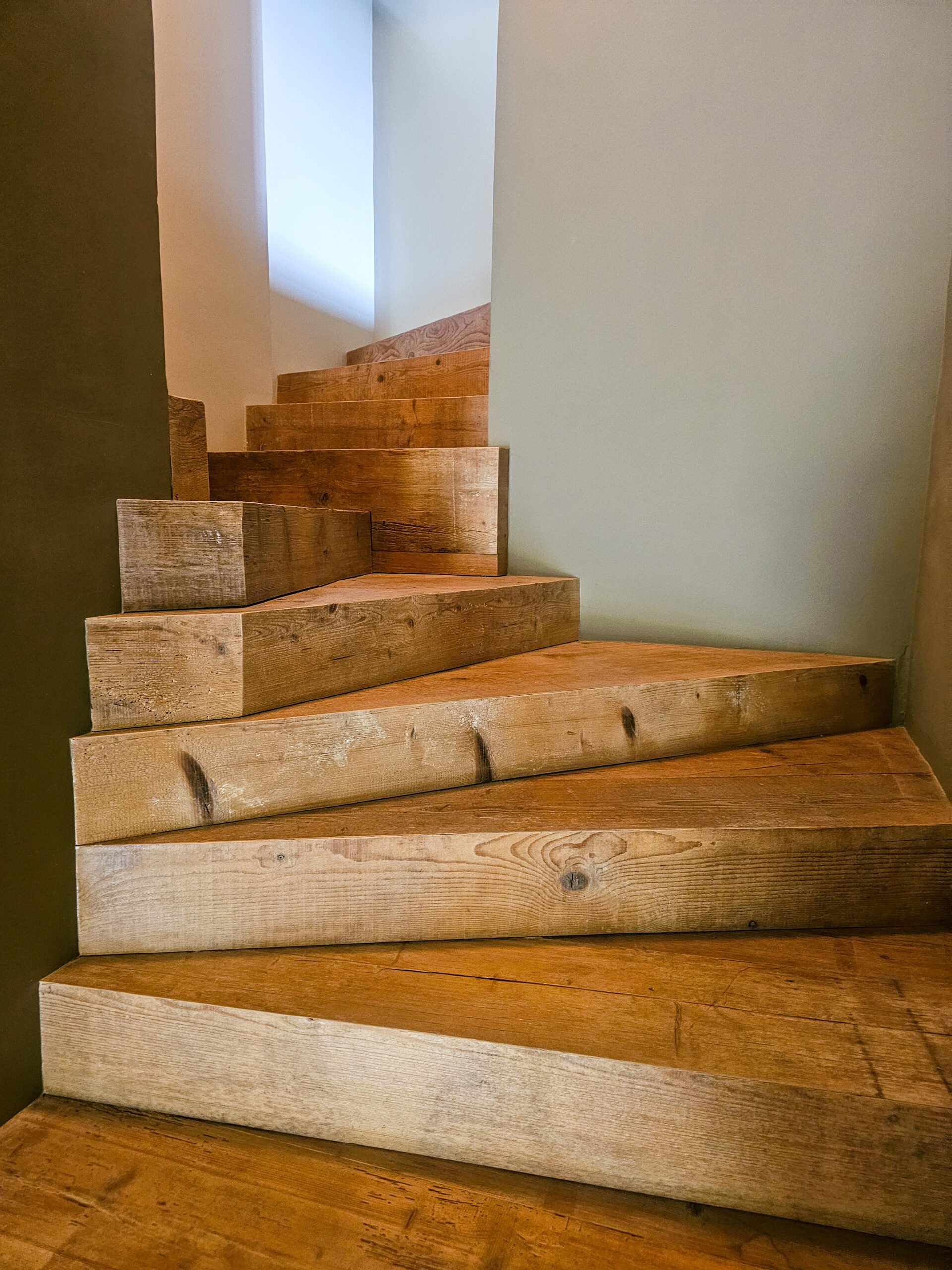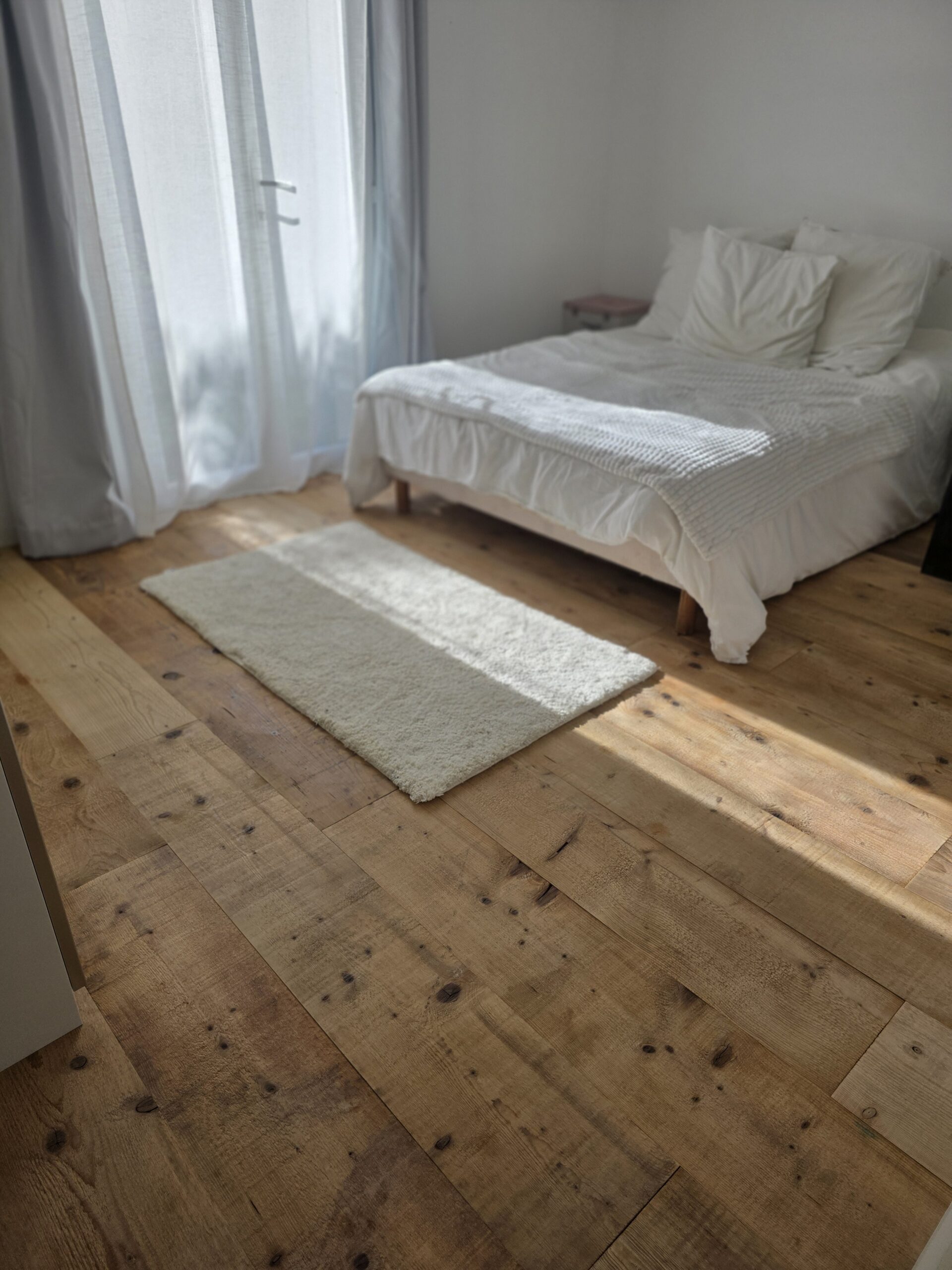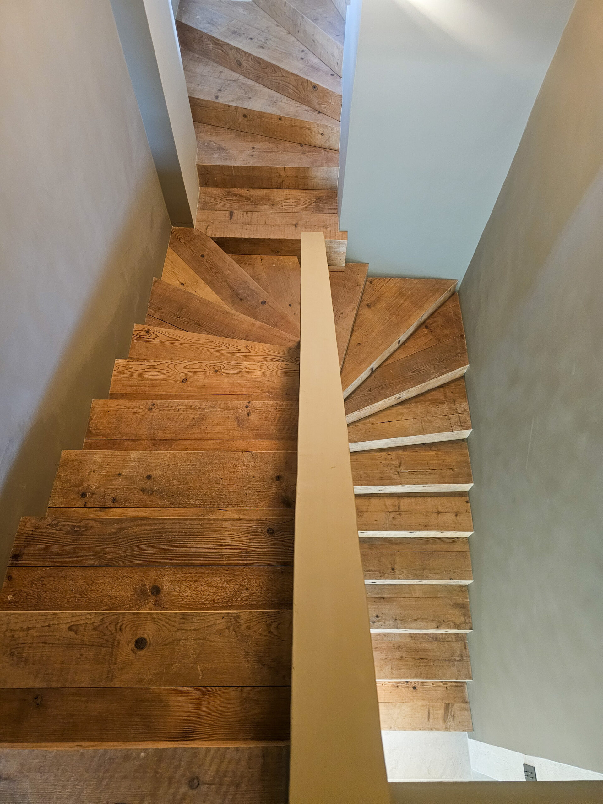 Reclaimed Antique French Plank ready to install. This is an old spruce floor recovered from cheese factories in various regions. The old boards were used to store and mature cheeses. Today, we use this old wooden floor to bring authenticity to your building projects. These reclaimed wooden planks are prepared in our carpentry workshop.